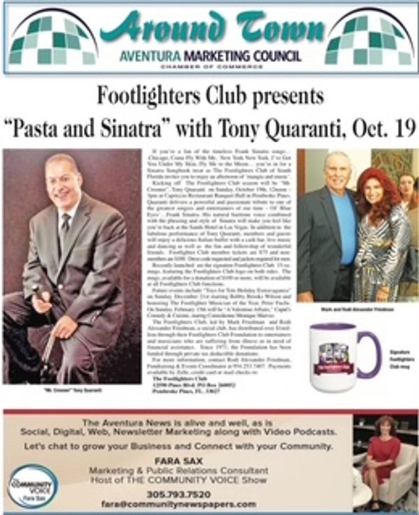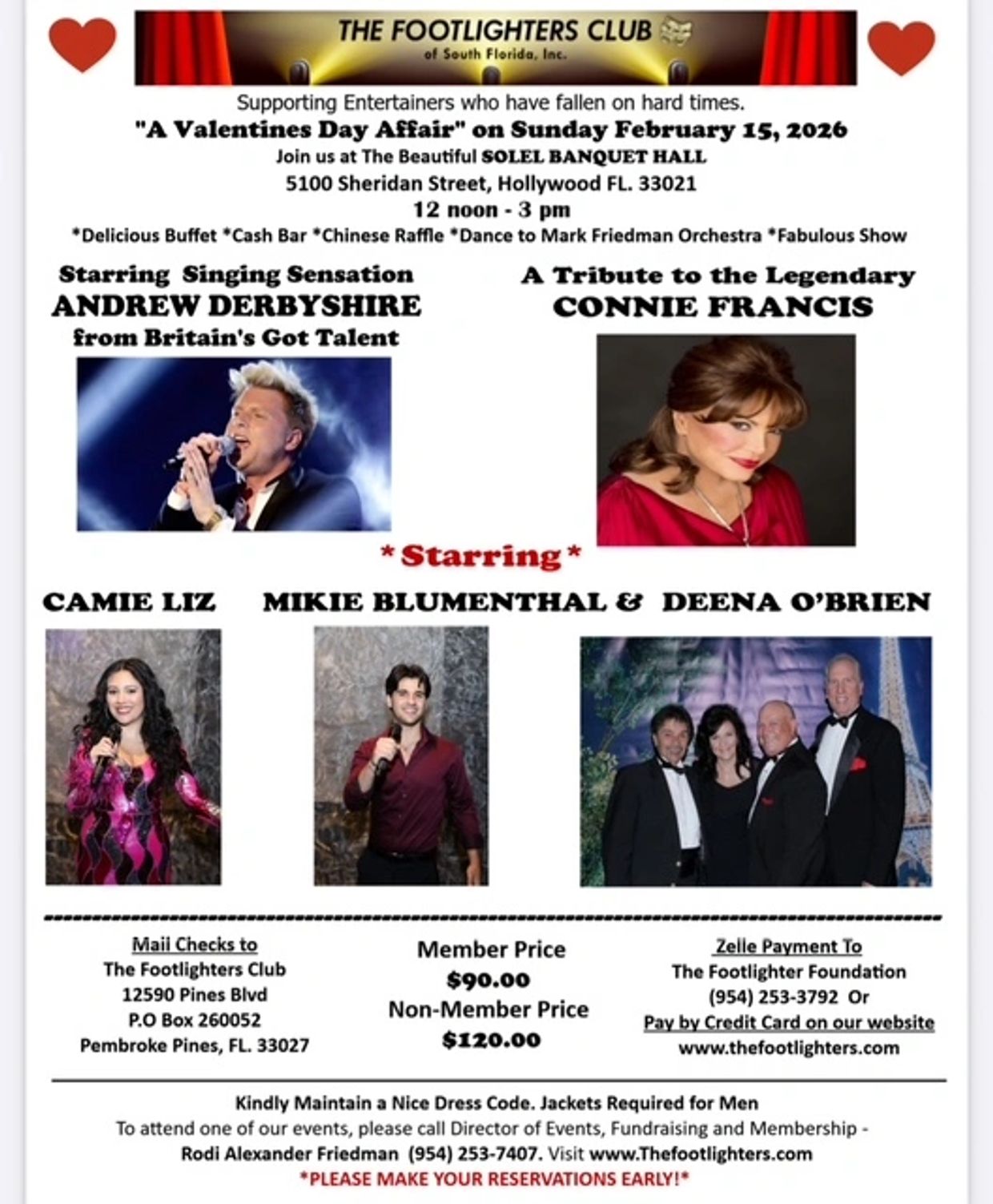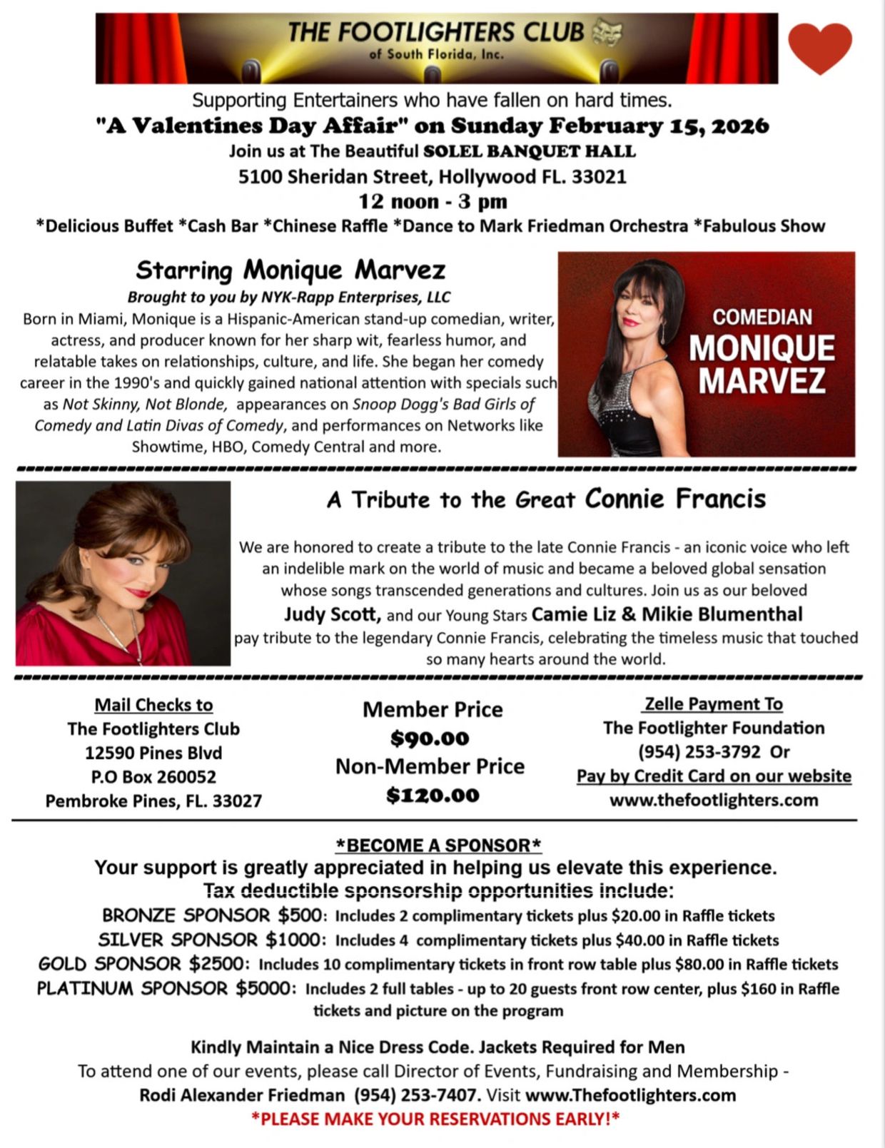 SINCE 1971 THE FOOTLIGHTERS FOUNDATION, A 501C3, THROUGH PRIVATE TAX DEDUCTABLE DONATIONS, HAS DISTRIBUTED OVER ONE MILLION DOLLARS TO ENTERTAINERS AND MUSICIANS SUFFERING FROM ILLNESS OR IN NEED OF FINANCIAL ASSISTANCE.